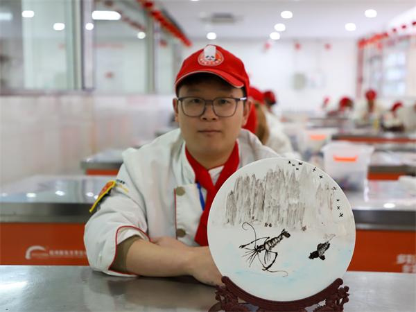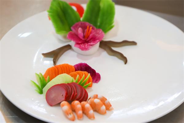 在整體構(gòu)圖上,學(xué)員們也巧妙地借鑒了中國畫的基本技法,運(yùn)用寫實(shí)和寫意相結(jié)合的藝術(shù)手法,虛實(shí)構(gòu)圖,合理布局,使菜品更有立體感和層次感。正可謂是取神得形,以線立形,以形達(dá)意。