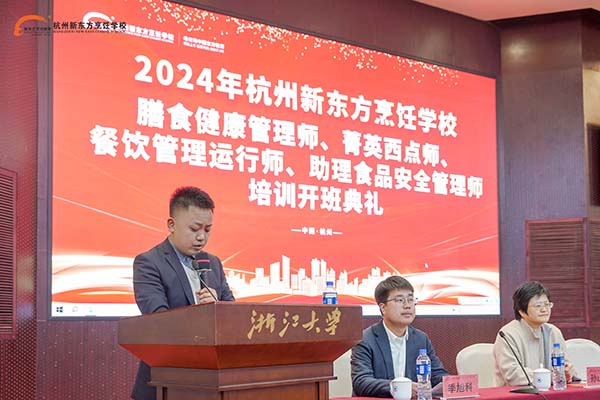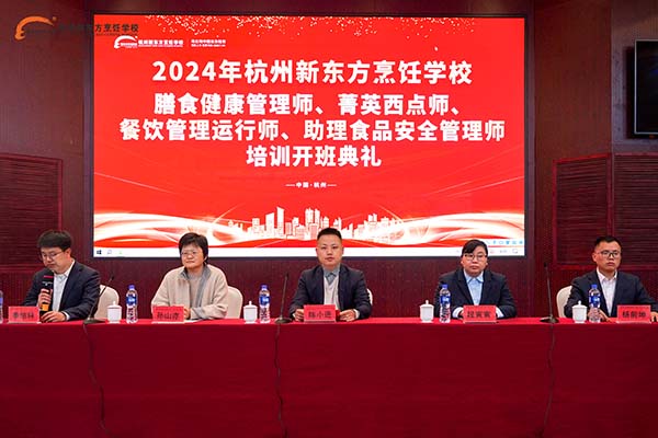 杭州新東方職業(yè)學(xué)校校區(qū)主任陳小進(jìn)、教務(wù)處主任段寅寅、學(xué)工處主管楊前坤以及中國(guó)飯店協(xié)會(huì)營(yíng)養(yǎng)學(xué)教授孫山亦出席了本次開(kāi)班典禮。