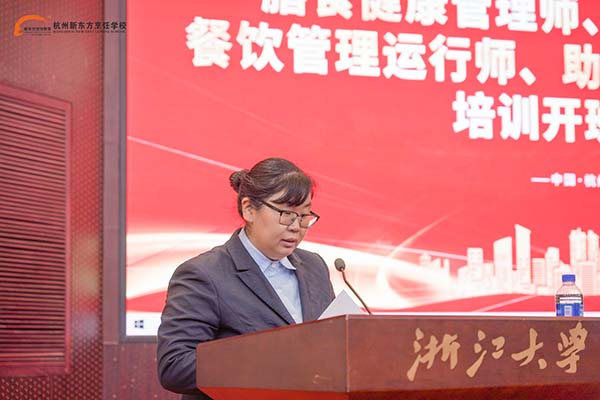 杭州新東方職業(yè)學(xué)校教務(wù)主任段寅寅首先發(fā)表了致辭。她代表教學(xué)區(qū)對(duì)中國(guó)飯店協(xié)會(huì)表示衷心的感謝,對(duì)各位學(xué)員的到來(lái)表示熱烈的歡迎。