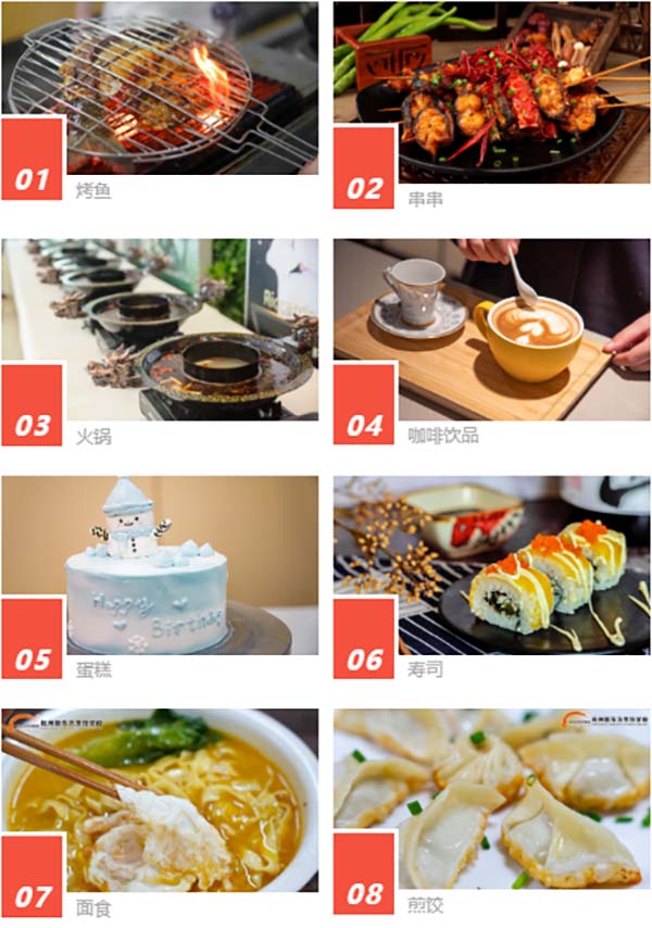 學(xué)習(xí)品種多元化:烤魚、火鍋串串、燒烤、咖啡飲品、小龍蝦、涼菜、熱菜、蛋糕、裱花、烤鴨、麻辣燙、壽司、面食、早餐等,應(yīng)有盡有!