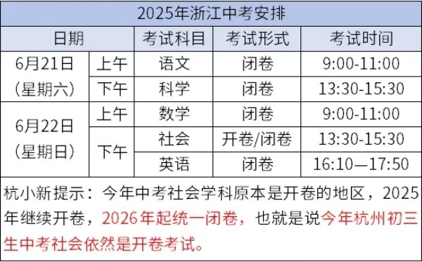 因?yàn)檎Z(yǔ)文、數(shù)學(xué)、英語(yǔ)、科學(xué)和社會(huì)實(shí)行省級(jí)統(tǒng)一命題,所以全省中考時(shí)間相同,今年浙江中考安排在6月21日-22日,比去年整體提前1天。