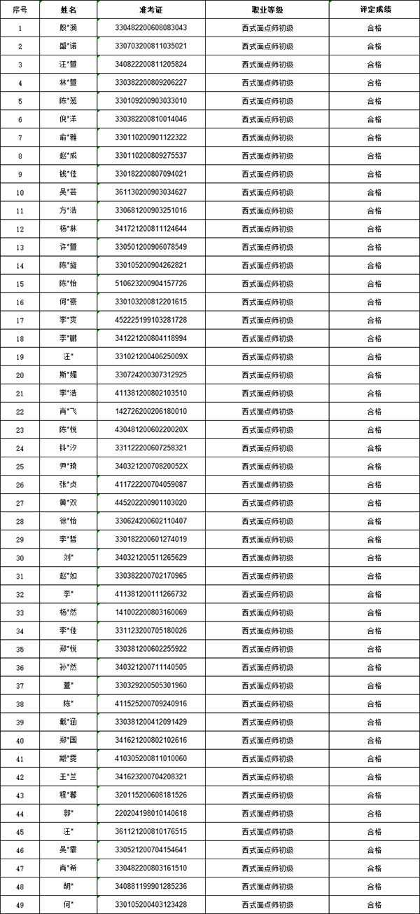 2025年7月27日杭州市余杭區(qū)新東方烹飪學(xué)校職業(yè)技能等級(jí)認(rèn)定結(jié)果 2025年7月27日,我校開展西式面點(diǎn)師初級(jí)工59人(2025-S-004568)的職業(yè)技能等級(jí)認(rèn)定工作,現(xiàn)將認(rèn)定成績公示如下,公示期為2025年8月8日——2025年8月14日: 上一篇:杭州新東方烹飪學(xué)校中餐2025級(jí)7月入學(xué)新生見面會(huì)圓滿落幕 下一篇:2025年7月26日杭州市余杭區(qū)新東方烹飪學(xué)校職業(yè)技能等級(jí)認(rèn)定結(jié)果