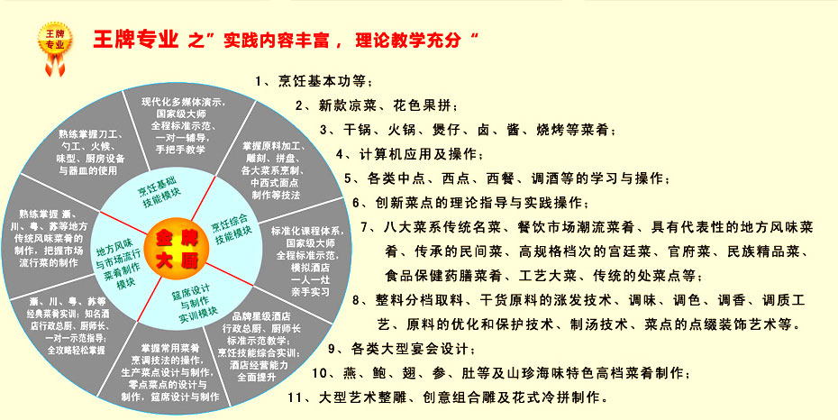 理論部分 主修:《烹調(diào)工藝》、《烹飪營(yíng)養(yǎng)與衛(wèi)生》、《烹飪概論》、《烹飪?cè)蠈W(xué)》、《餐飲管理》、《中西點(diǎn)基礎(chǔ)知識(shí)》、《成功秘籍(職素)》、《就業(yè)寶典(職素)》。